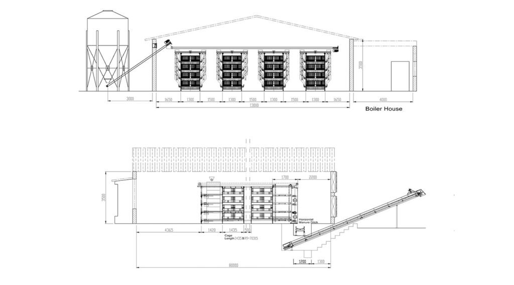 4-Tier Cages: Side wall height 3.5 m; 49 cages per row; total capacity 37,632 birds.